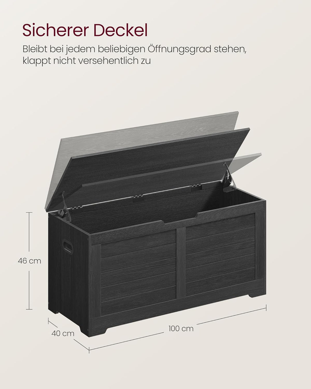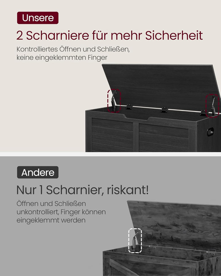 - 【2 SICHERHEITSSCHARNIERE, FÜR MEHR SICHERHEIT】Der Deckel ist mit zwei stabilen Scharnieren ausgestattet, die dafür sorgen, dass er in jedem Winkel geöffnet bleiben und sanft schliessen kann. So besteht keine Gefahr, dass Ihre Finger eingeklemmt