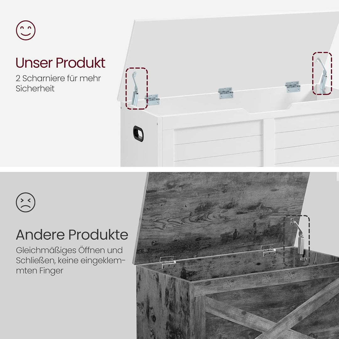 - 【2 SICHERHEITSSCHARNIERE, FÜR MEHR SICHERHEIT】Der Deckel ist mit zwei stabilen Scharnieren ausgestattet, die dafür sorgen, dass er in jedem Winkel geöffnet bleiben und sanft schliessen kann. So besteht keine Gefahr, dass Ihre Finger eingeklemmt