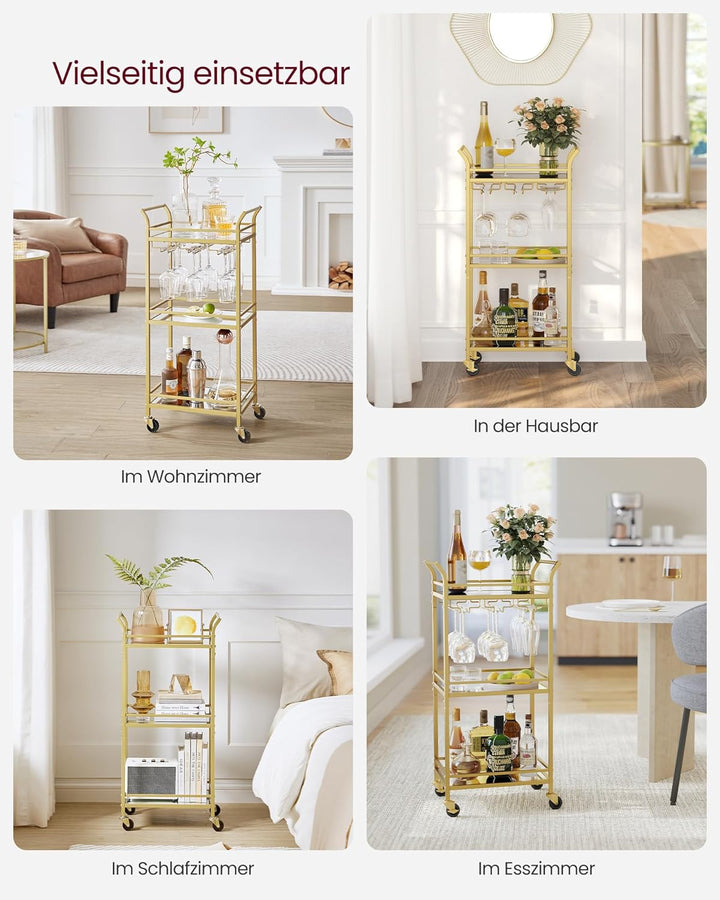 • [Charmante verspiegelte Glasablagen] Die verspiegelten Glasablagen verleihen diesem Servierwagen einen attraktiven Charme. Sie reflektieren wunderschön Ihre Weingläser und -flaschen und bringen Ihrem Zuhause zeitlose Eleganz