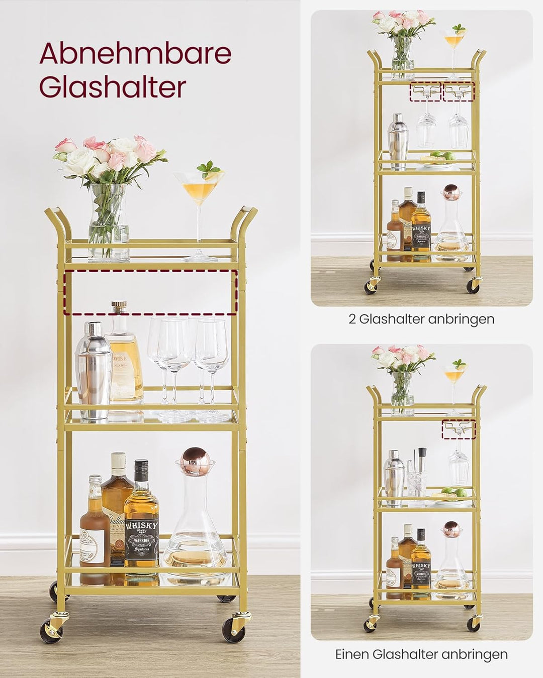 • [3 abnehmbare Glashalter] Dieser Wagen wird mit 3 Glashaltern geliefert, die Ihre Gläser stets griffbereit halten. Ausserdem sind alle Glashalter abnehmbar, d. h. Sie können sie nach Bedarf anbringen