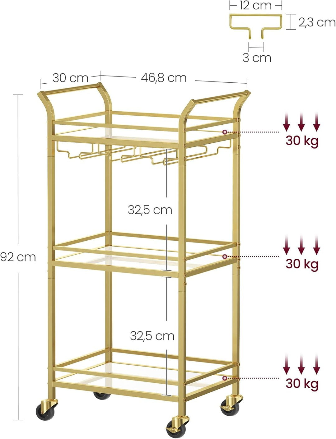 VASAGLE Servierwagen, 3 Ebenen, Rollwagen, mit Rollen, Griffen, verspiegelte Glasablagen, für kleine