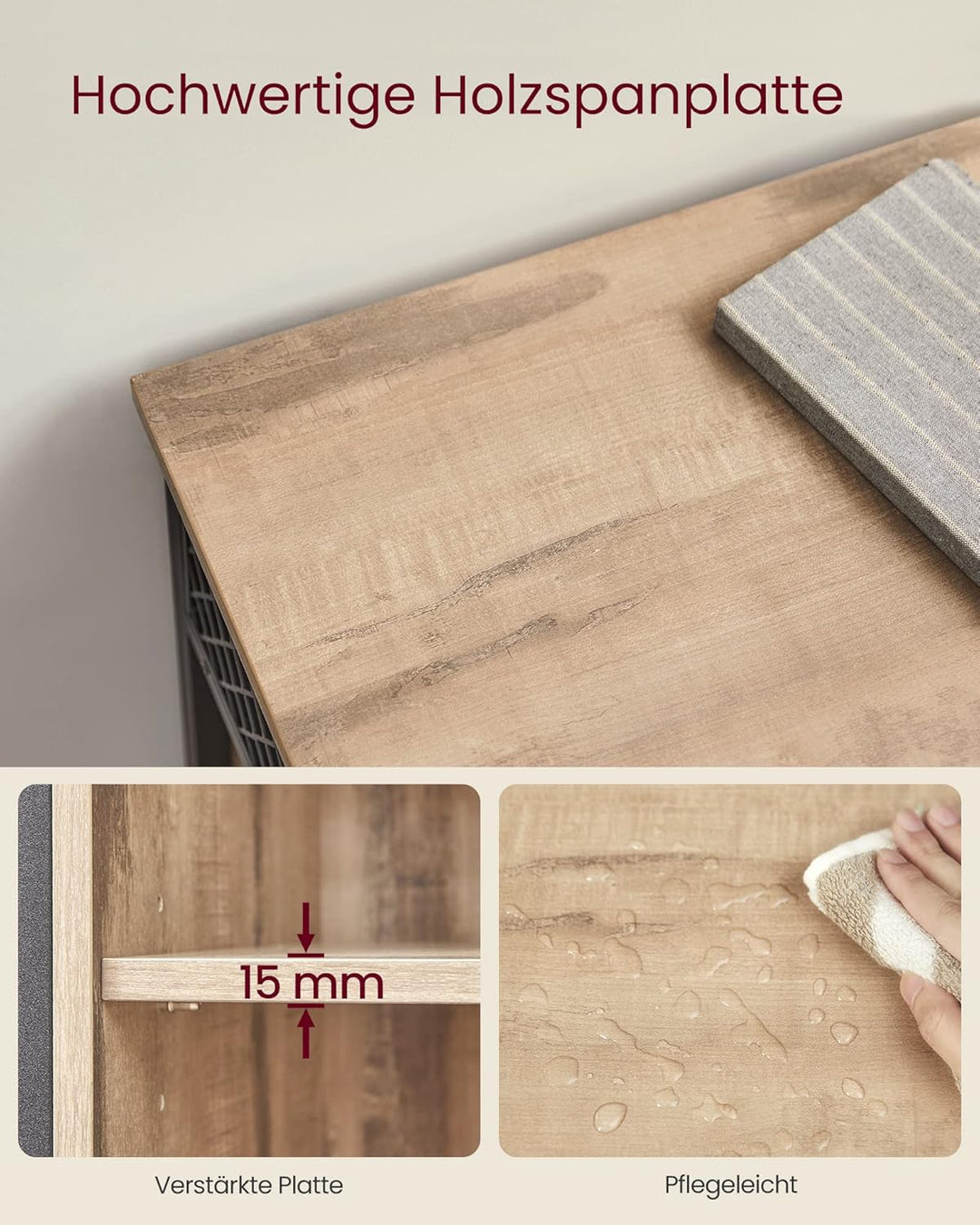 - [Robust und stabil] Die Kombination aus Holzspan und hochwertigem Metallgestell verleiht dem Sideboard eine hohe Stabilität und Festigkeit. Die verstellbaren Füsse halten den Schrank im Gleichgewicht; der Kippschutz sorgt für zusätzliche Stabilität