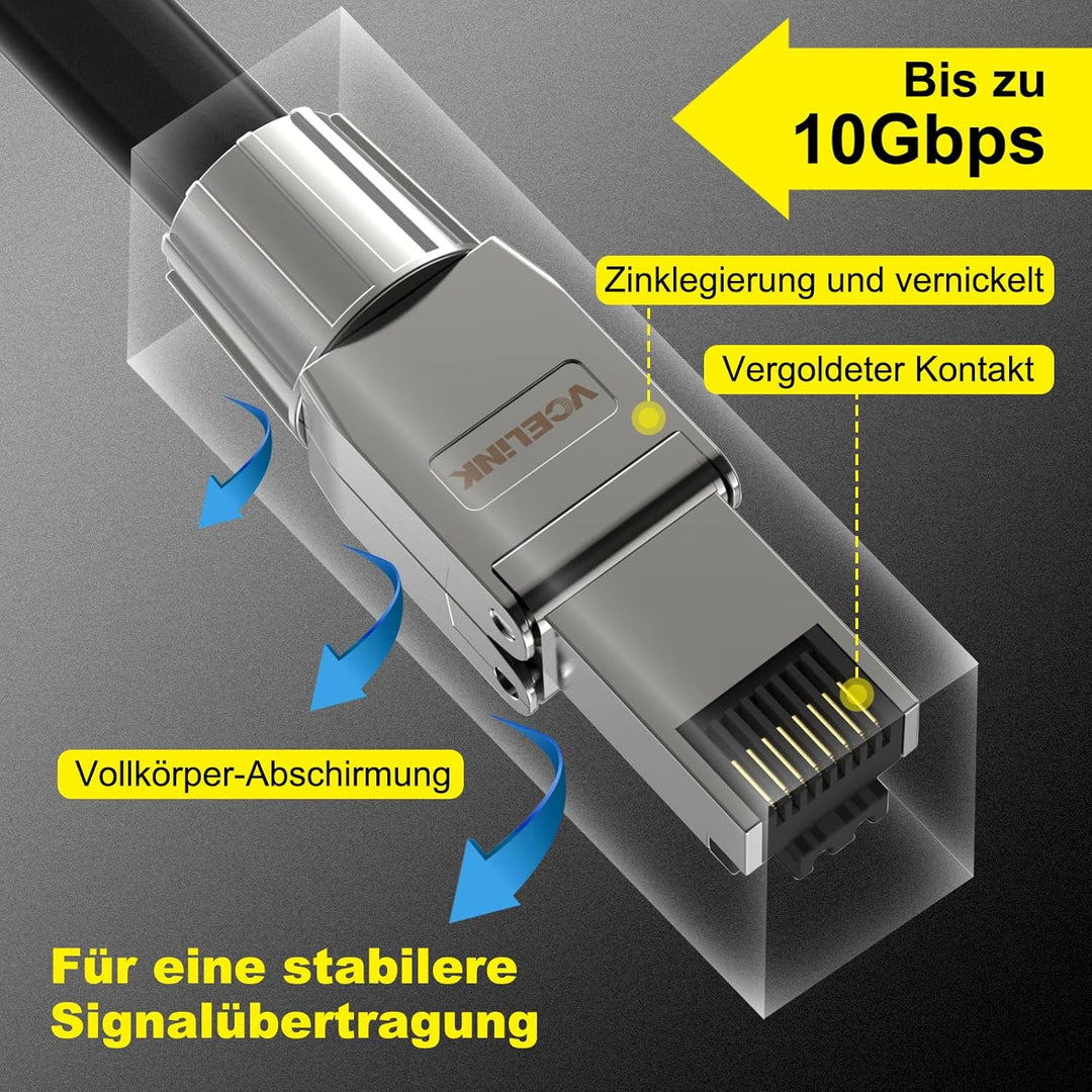 - Vollmetall-Struktur: Das gesamte Gehäuse des Lan Kabel Stecker besteht aus einer Zinklegierung, wodurch externe Störungen der Netzwerksignale wirksam abgeschirmt werden können. Die vergoldeten Kontakte aus Phosphorbronze übertragen Signale schnell