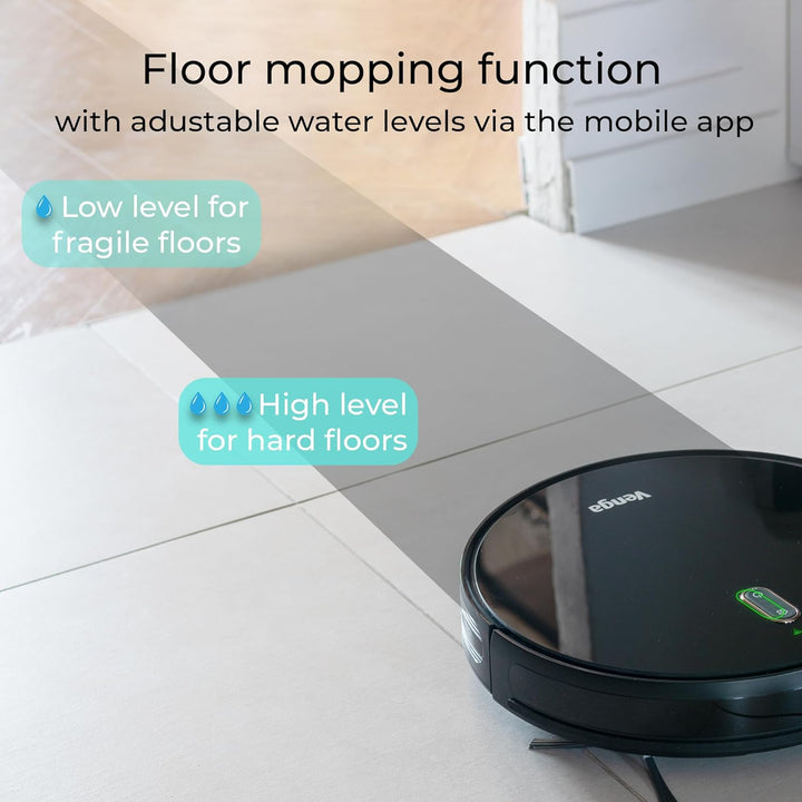 - GYROSCOP NAVIGATION, die es dem Roboter ermöglicht, Ihr Haus für eine effizientere Reinigung zu kartieren. Mit Wi-Fi-Verbindung zur Steuerung und Planung der Reinigung von Ihrem Mobiltelefon aus über eine mit Venga! App. "One Touch" Start, um einen
