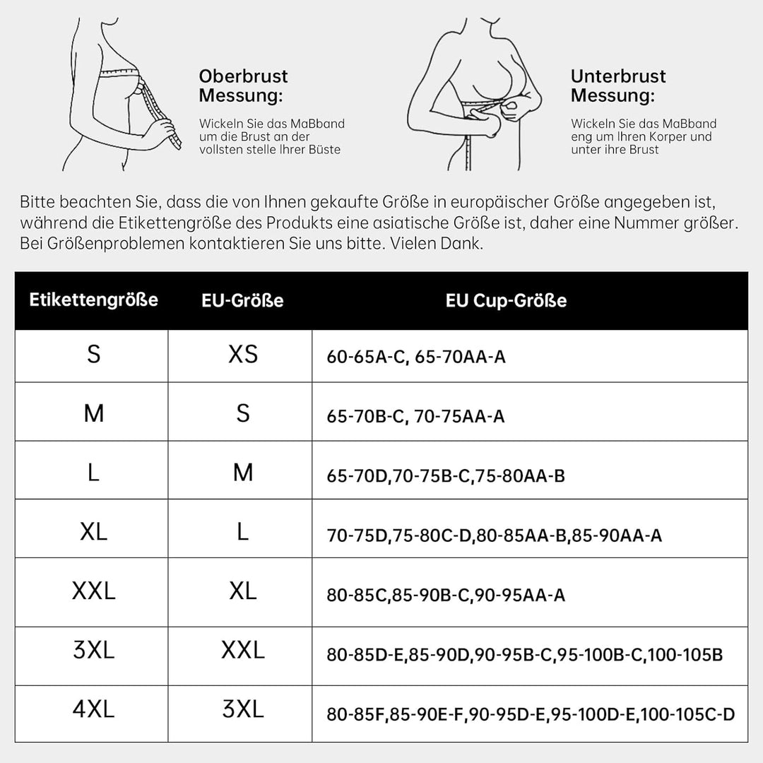 - Die obige Grössentabelle ist eine europäische Standardgrösse. Bitte bestellen Sie entsprechend der tatsächlichen europäischen Grösse. Wenn Ihr Rücken relativ dick ist, wird empfohlen, einen grösseren BH zu bestellen. Da wir asiatische Verkäufer