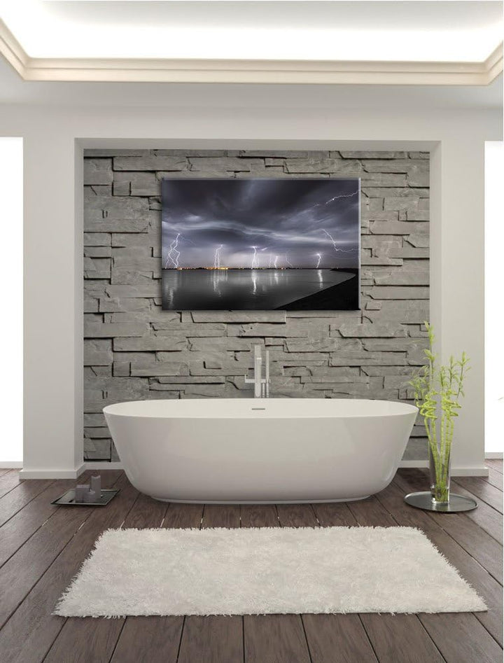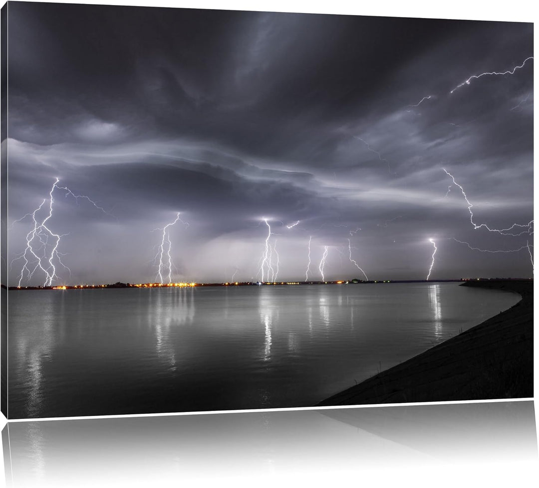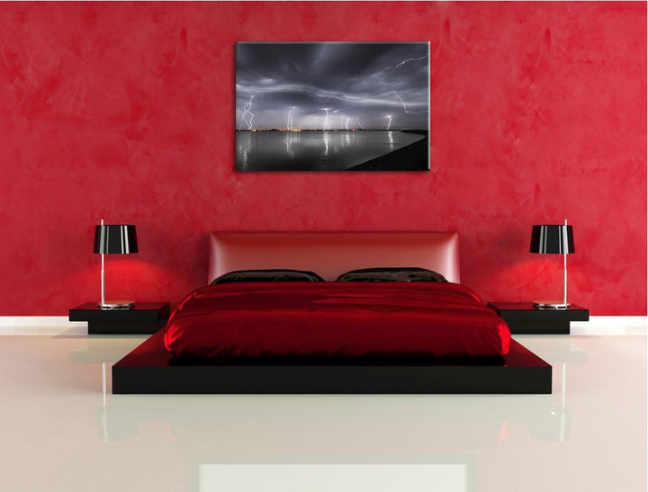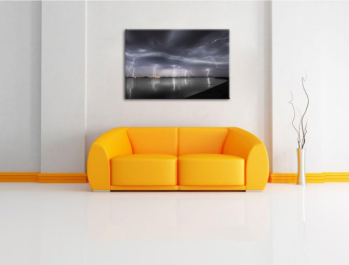 viele Blitzeinschläge über Stadt schwarz/weiss Format: 100x70 auf Leinwand, XXL riesige Bilder ferti