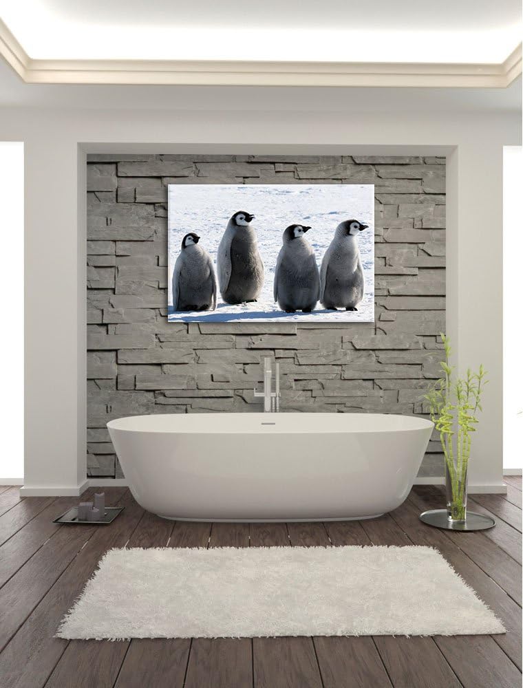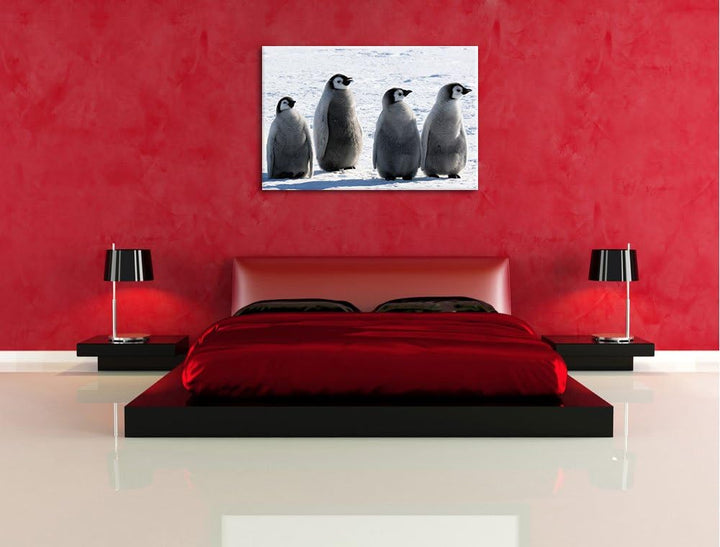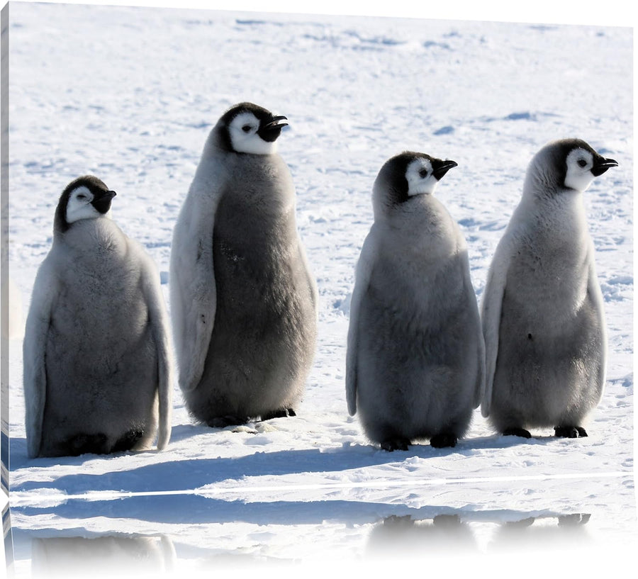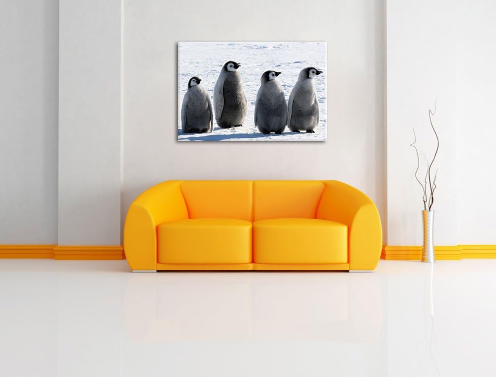 vier Kaiserpinguinküken Leinwand, XXL riesige Bilder fertig gerahmt mit Keilrahmen, Kunstdruck auf W