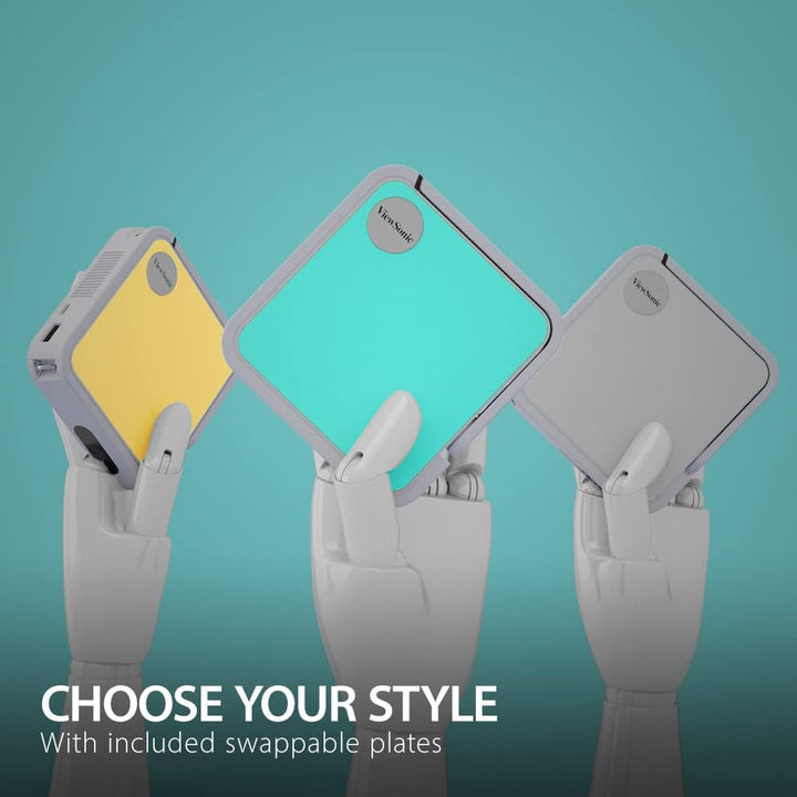- Lieferumfang: ViewSonic M1 Mini LED-Beamer, Micro USB Kabel, Netzkabel, Kurzanleitung, Fernbedienung, austauschbares Cover (mint, gelb, grau)