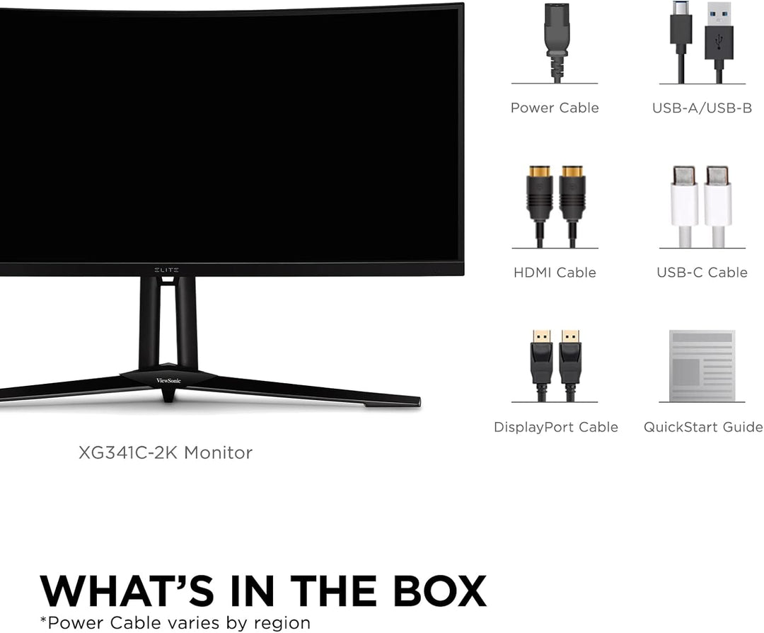 - Lieferumfang: ViewSonic XG341C-2K Monitor, DP-, USB 3.2-, HDMI 2.1-, Netzkabel, Kurzanleitung