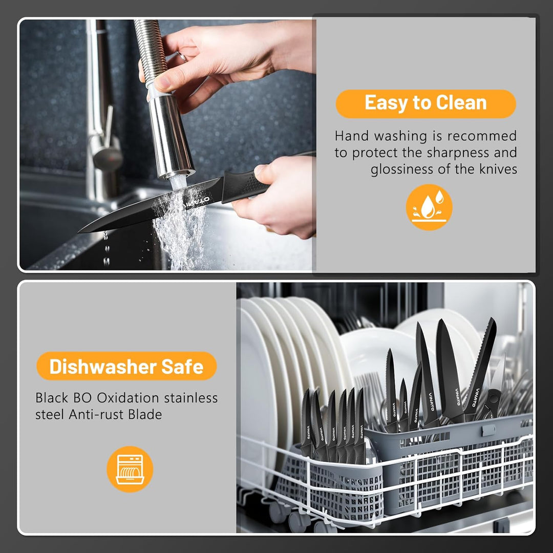 - 【Hochwertiges Messerset】Premium-Edelstahlklingen mit schwarzer BO-Oxid-Technologie und keramischer Antihaftbeschichtung auf den Klingen machen das Schneiden einfacher und die Klingen bleiben länger scharf. Küchenprofi-Messer set ist praktisch,
