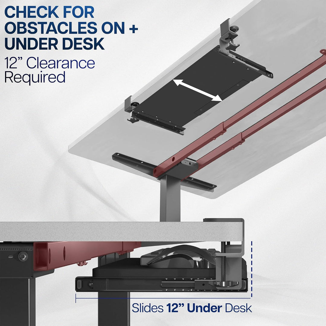 - Stabile C-Klemmen – Befestigen Sie die Tastaturablage an Ihrem Arbeitsplatz, ohne Schäden an Ihrem Schreibtisch zu verursachen (3,2 cm maximale Schreibtischstärke) mit stabilen C-Klemmen, die alles fest an Ort und Stelle halten und leicht verstellbar