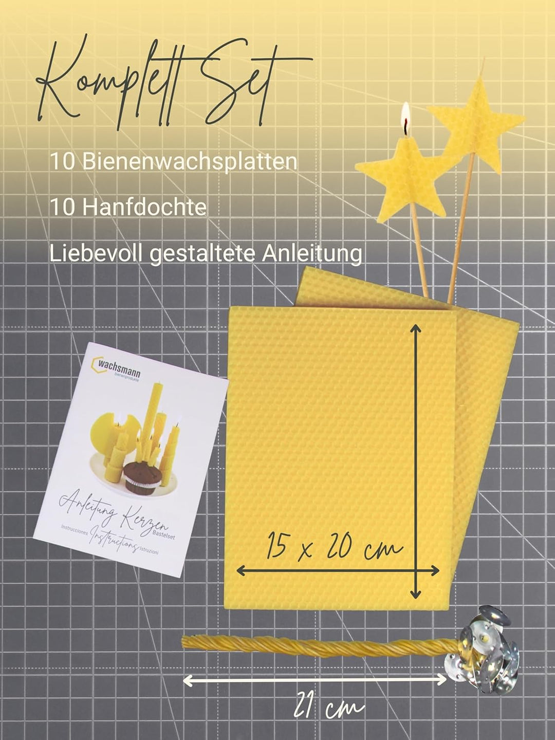 - 🕯️ DEIN KOMPLETTES STARTERSET FÜR 10 KERZEN – Alles drin, was Du brauchst: 10 farbige Bienenwachsplatten (20 × 15 cm), 10 vorgewachste Hanfdochte (21 cm Länge) und eine ausführliche, bebilderte Anleitung. Ideal, um sofort loszulegen – auch