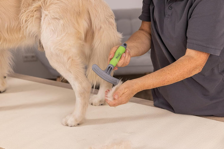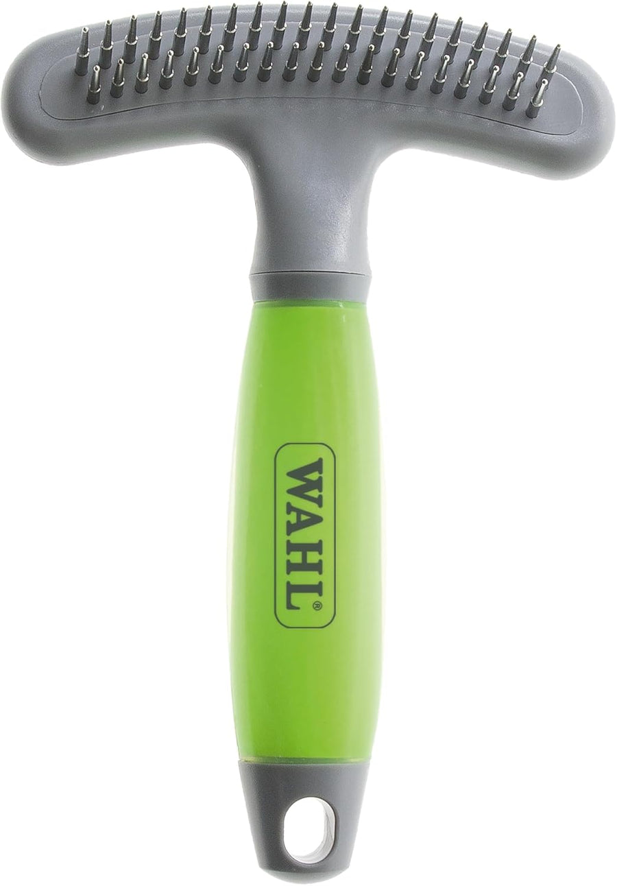 - Unterwollrechen mit drehenden Metall-Pins zum effektiven Entwirren und Entfernen der Unterwolle.
