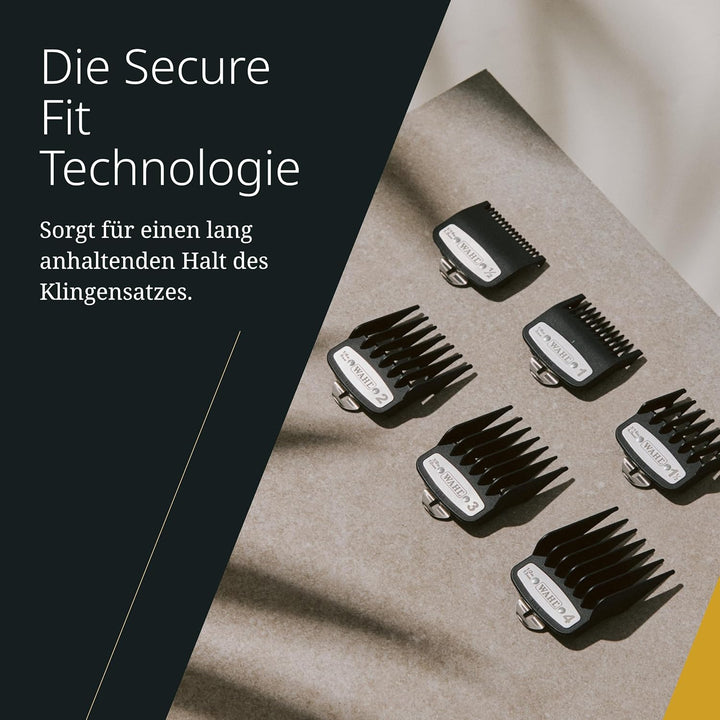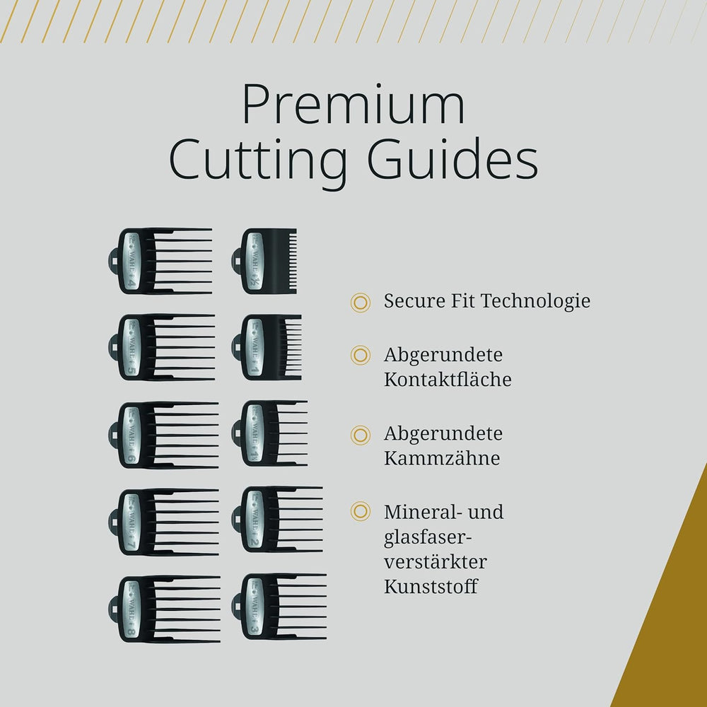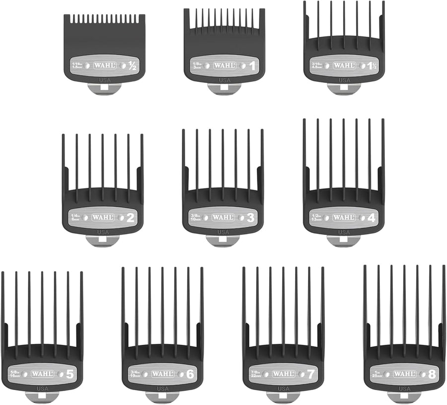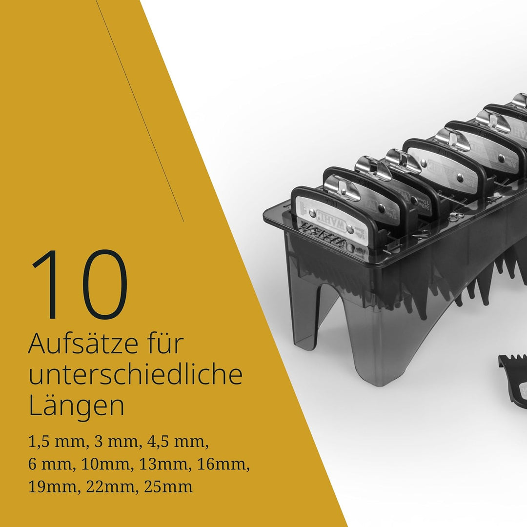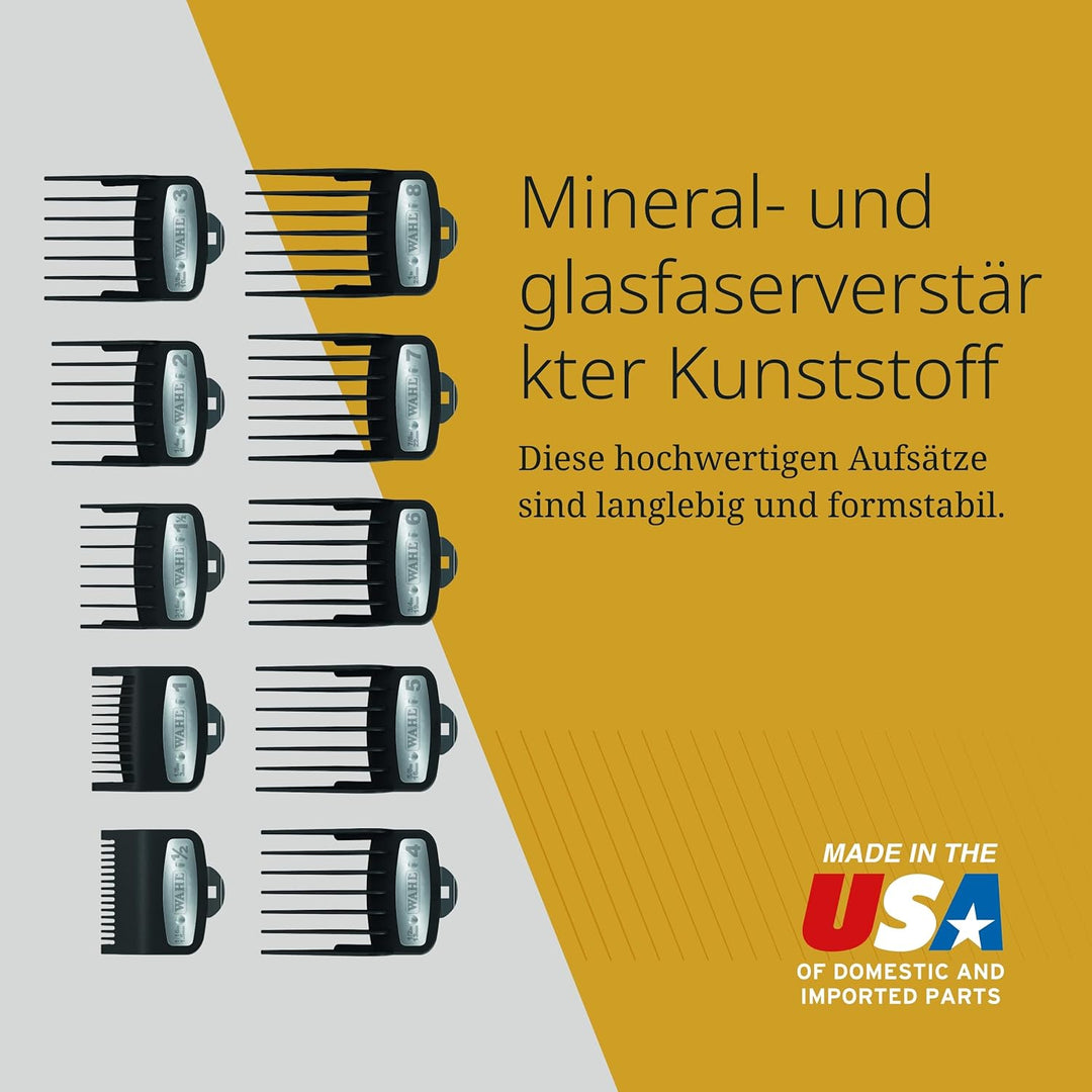 - 10 Kämme: Die Schneidsätze sind in verschiedenen Grössen von 1,5 mm bis 25 mm erhältlich. Sie passen auf alle kabelgebundenen Haartrimmer von Wahl und bieten die Möglichkeit, verschiedene Haarlängen und -stile zu erzielen.