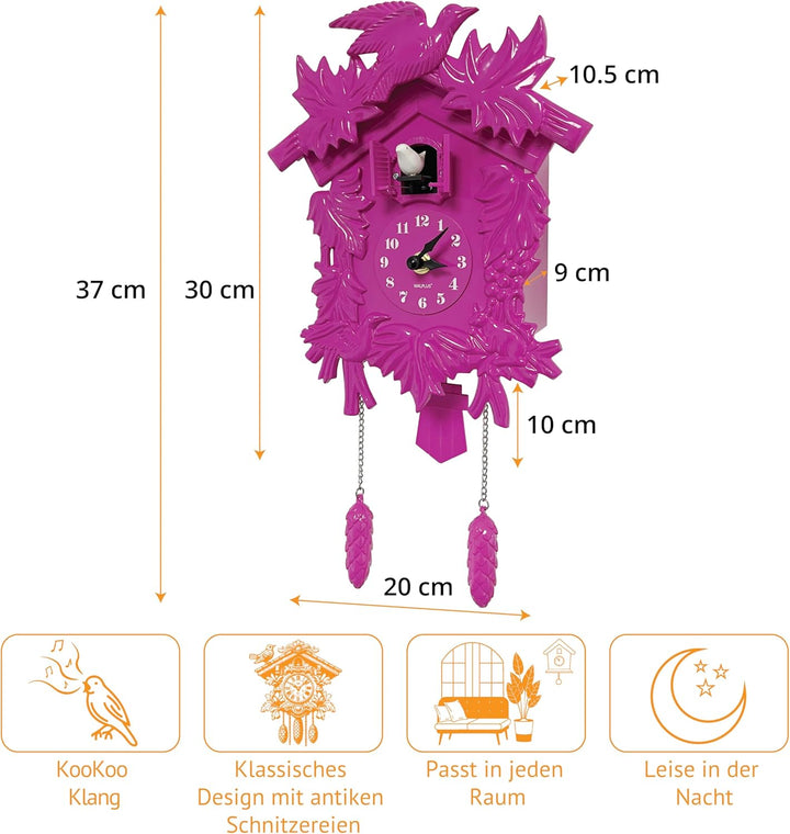 - Kuckuckvogel springt aus und singt einmal jede Stunde von 6 bis 21 Uhr.