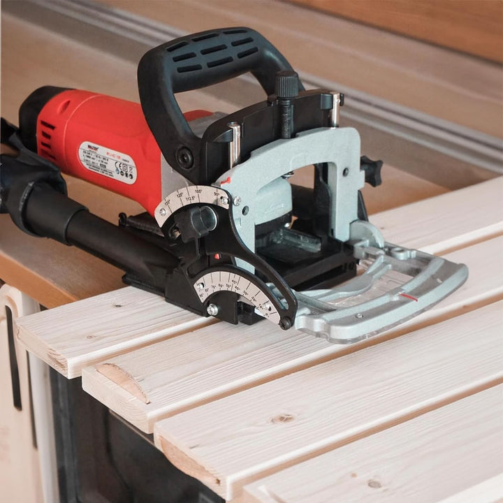 • Die Flachdübelfräse hat eine Leistung von 900 W, was sie zu einem leistungsstarken Werkzeug für die Holzbearbeitung macht. Dies ermöglicht es, Holzverbindungen präzise und effizient herzustellen