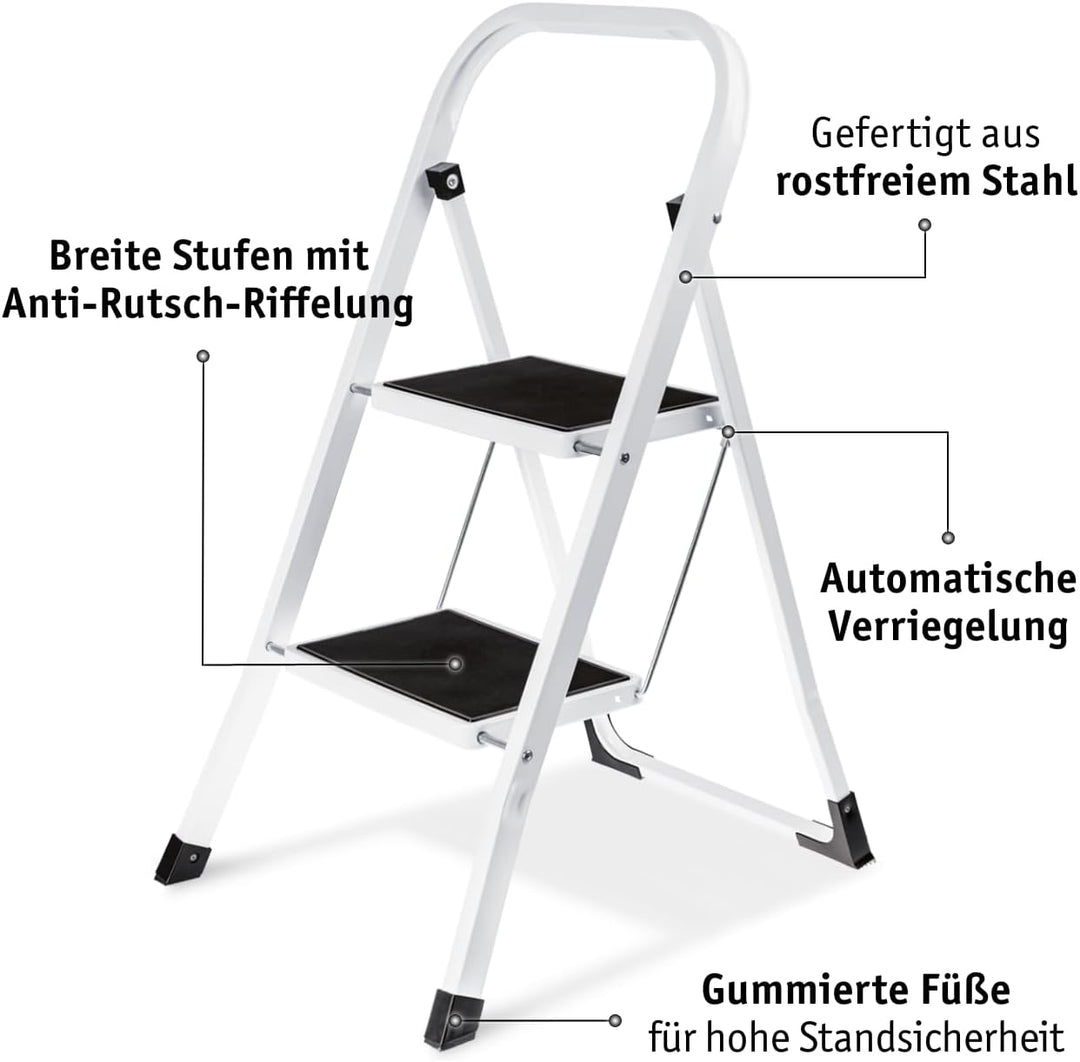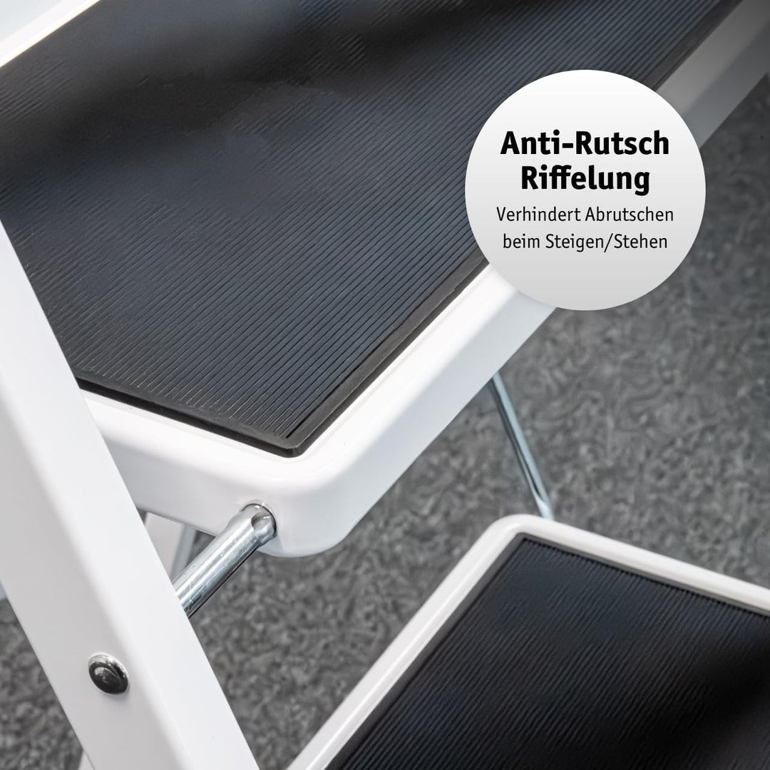 - Sicher & stabil: Die breiten Stufen mit rutschfester Riffelung, gummierte Füsse und die Sicherheitsverriegelung gewährleisten höchste Standfestigkeit und Sicherheit.