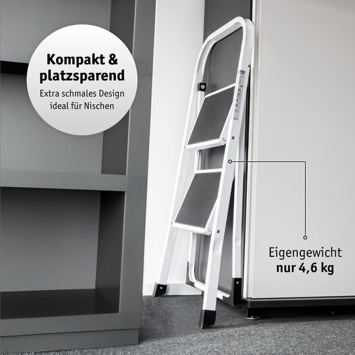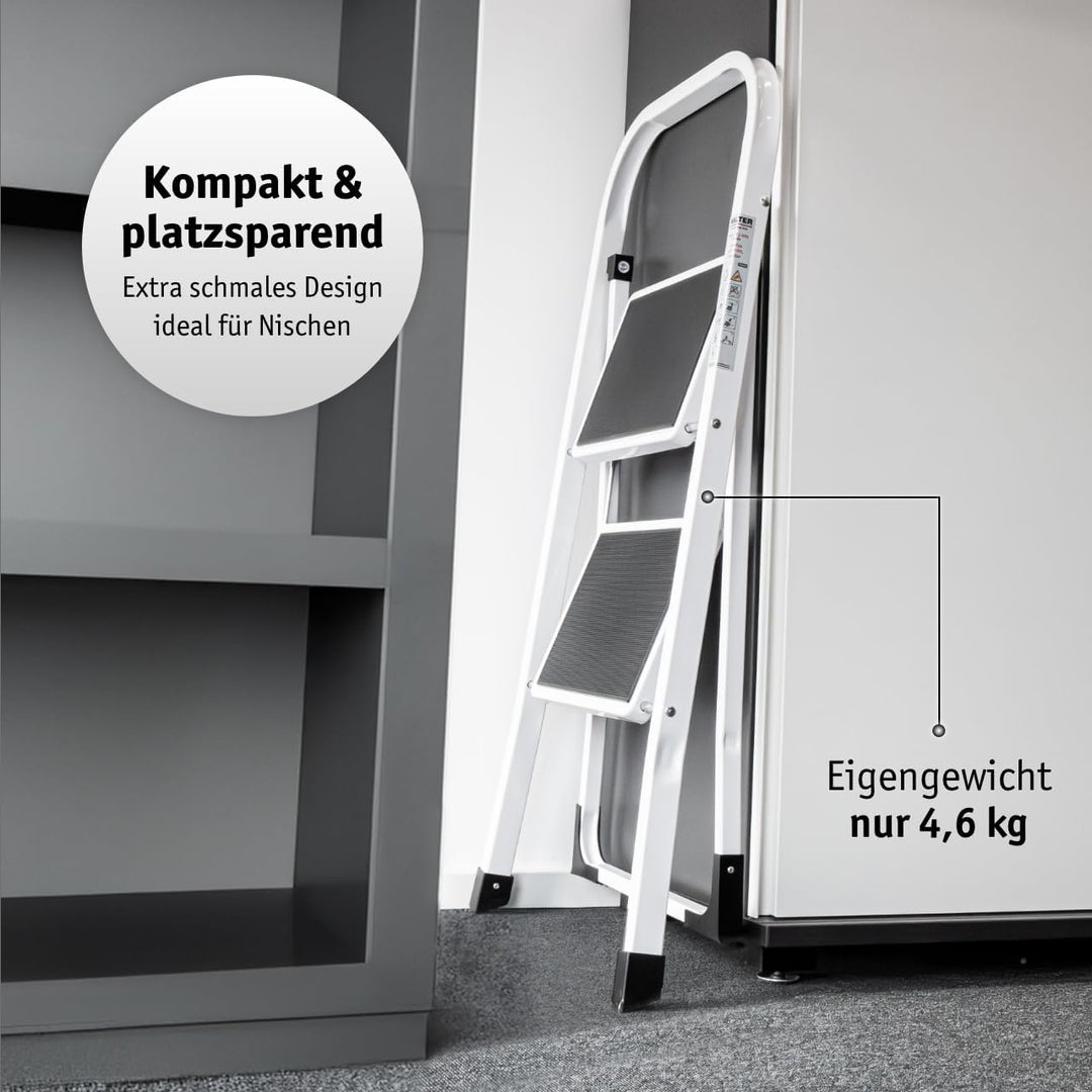 - Platzsparend & kompakt: Mit einem schlanken Design von nur 4 cm Tiefe lässt sich die Leiter spielend leicht in nahezu jeder Ecke verstauen.