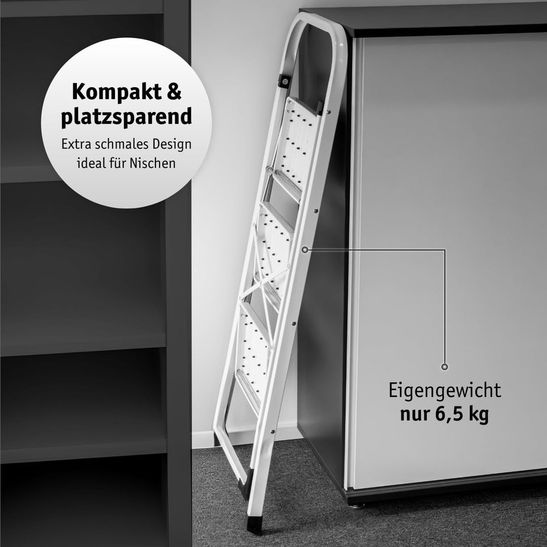 - Platzsparend & kompakt: Mit einem schlanken Design von nur 4 cm Tiefe lässt sich die Leiter spielend leicht in nahezu jeder Ecke verstauen.