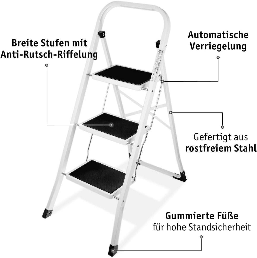- Sicher & stabil: Die breiten Stufen mit rutschfester Riffelung, gummierte Füsse und die Sicherheitsverriegelung gewährleisten höchste Standfestigkeit und Sicherheit.