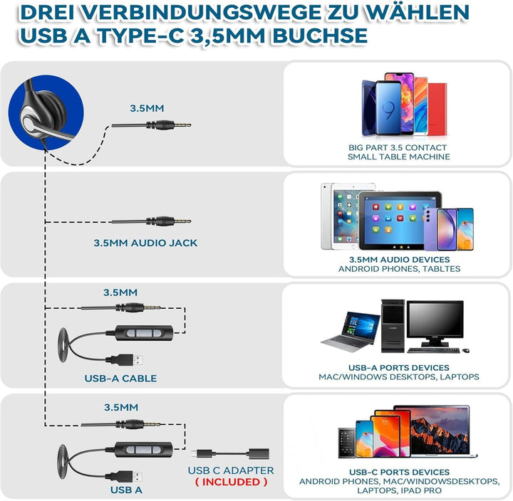 - [Breite Kompatibilität] Das Wantek 602F Headset mit Mikrofon und USB/3,5mm Stecker, Typ-c Adapter funktioniert mit fast allen Ihren Geräten wie Windows-Computern, Laptops, Tablets, Android-Telefonen mit 3,5mm Port und Apple-Geräten mit Typ-c Port.