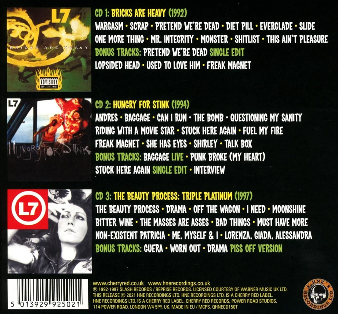 PRODUKTBESCHREIBUNGEN 3 CD Set mit den Alben „Bricks Are Heavy“ (1992), “Hungry For Stink” (1995) und „The Beauty Process“ (1997) – mit elf Bonustracks: B-Sides und Live-Mitschnitten.