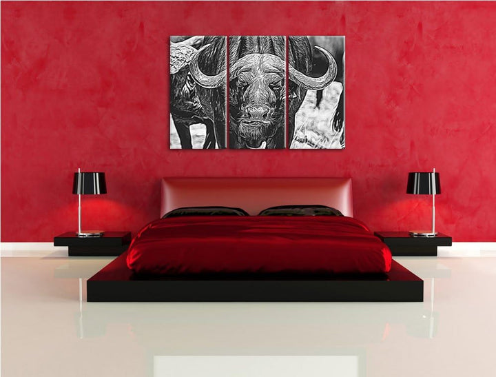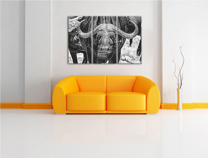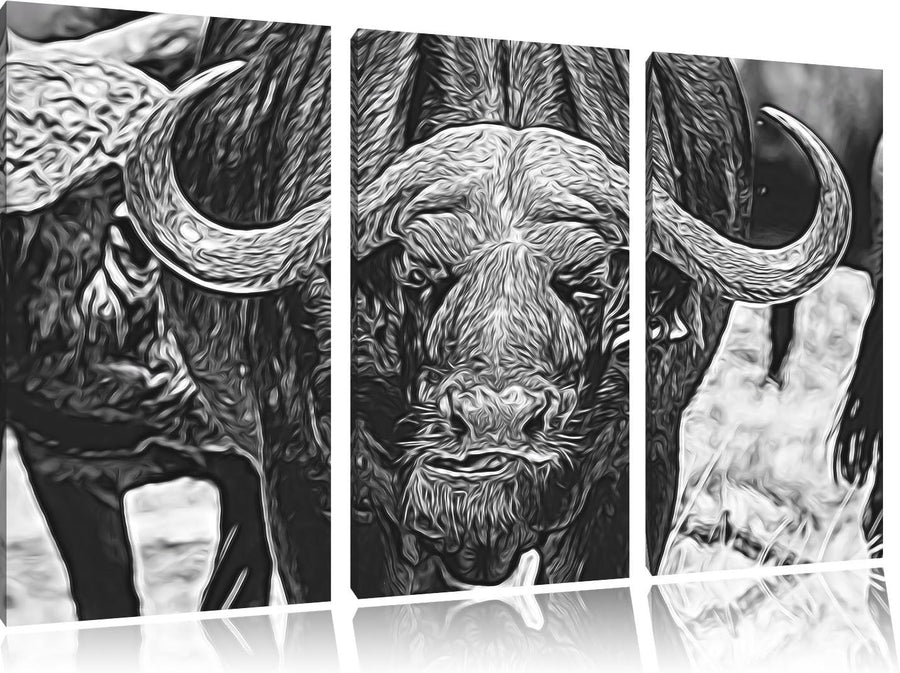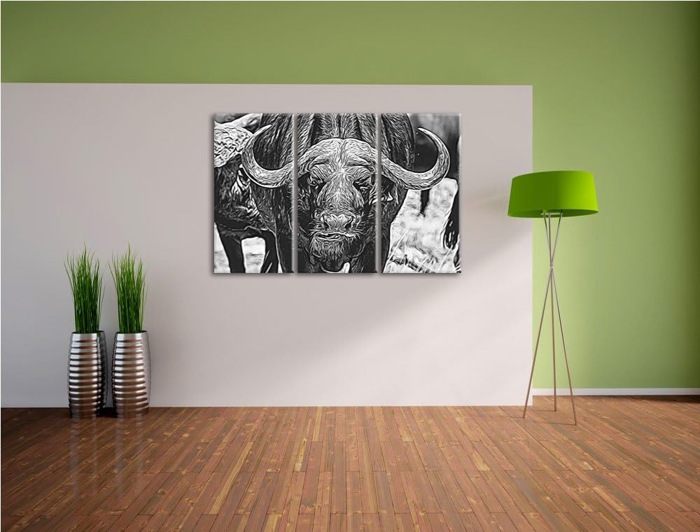 Wasserbüffel Schwarz/weiss Spezial 3-Teiler Leinwandbild 120x80 Bild auf Leinwand, XXL riesige Bilde