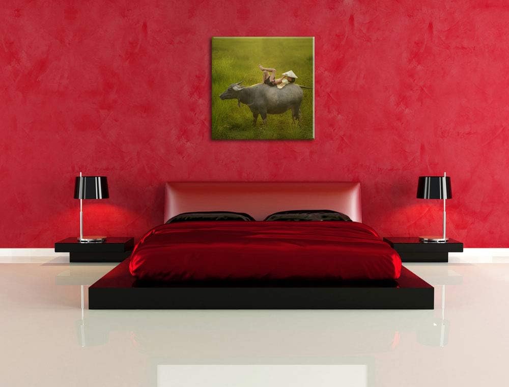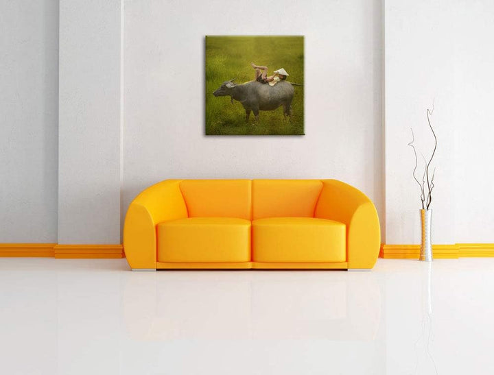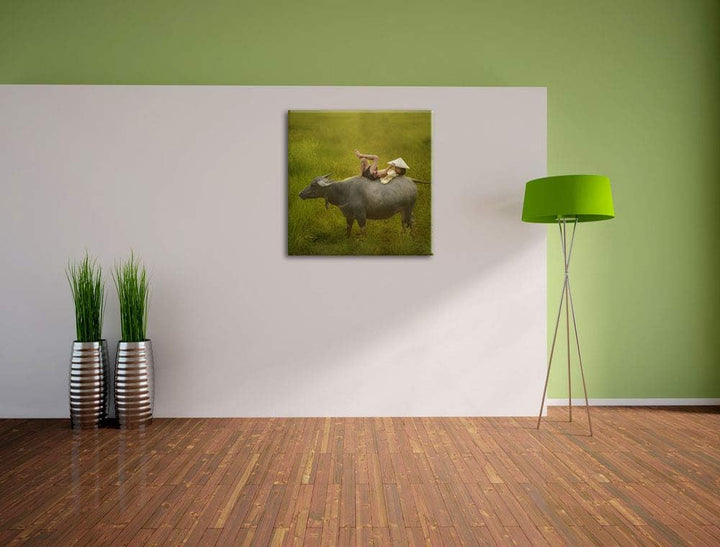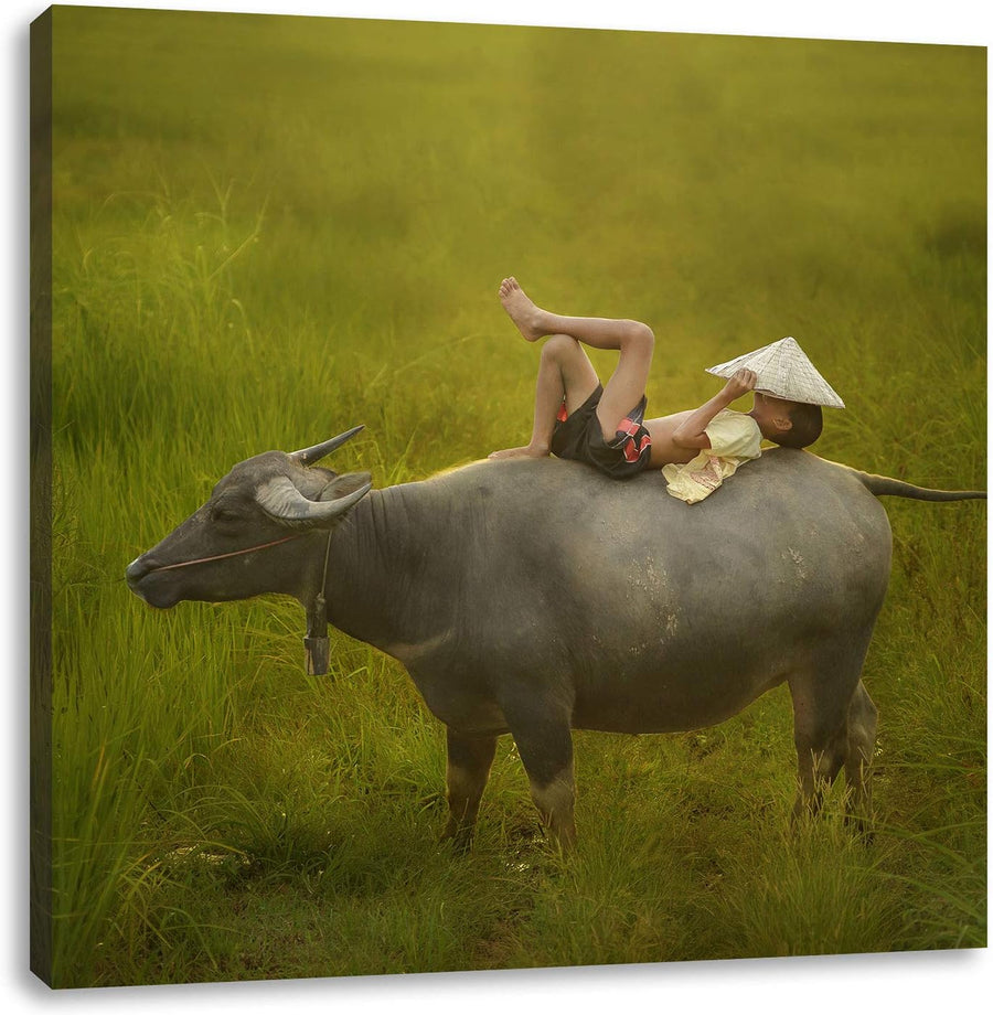 Wasserbüffel trägt Kind, Format: 70x70 auf Leinwand, XXL riesige Bilder fertig gerahmt mit Keilrahme