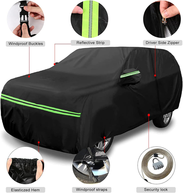 - All-Wetter-Schutz: Unsere Autoabdeckung bietet vollständigen Schutz vor schädlichen Elementen, unabhängig von der Jahreszeit. Ob es ein sonniger Sommertag oder eine stürmische Winternacht ist, unsere Autoabdeckung schützt Ihr Fahrzeug umfassend