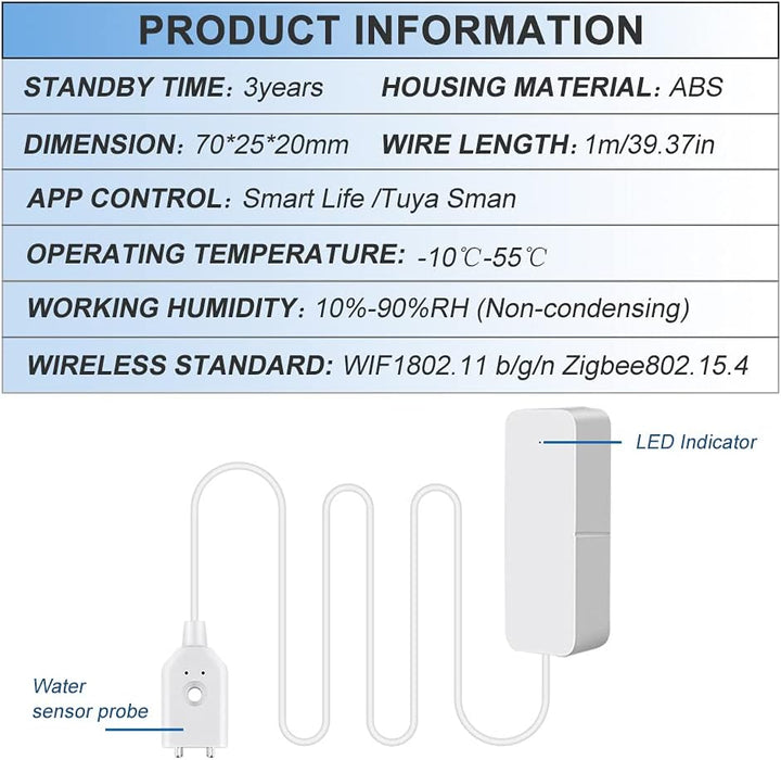 - 【Zuverlässige Leistung】Wenn der Wassersensor ein Wasserleck erkennt oder einen voreingestellten Grenzwert überschreitet, benachrichtigt er Sie über die APP über die Situation und verhindert so mögliche Wasserschäden.