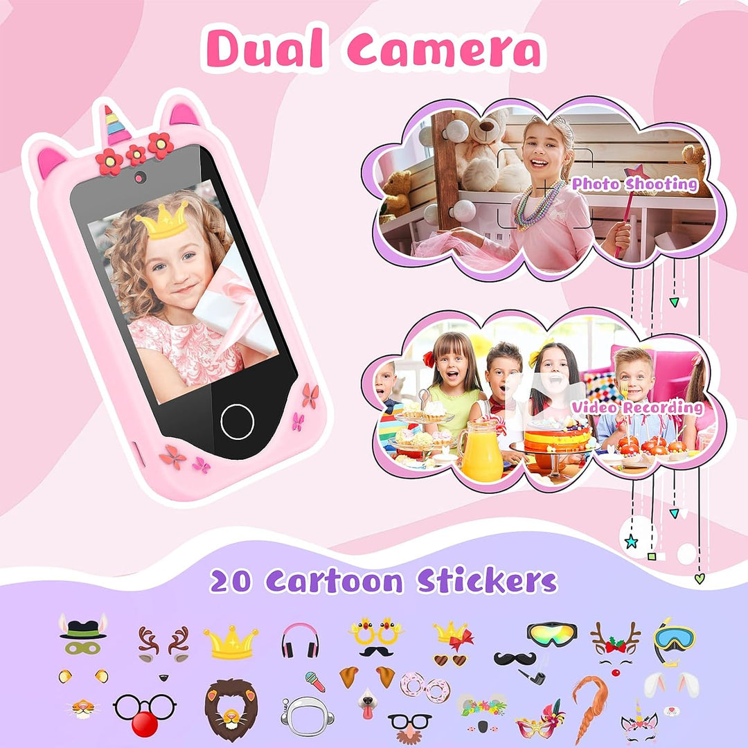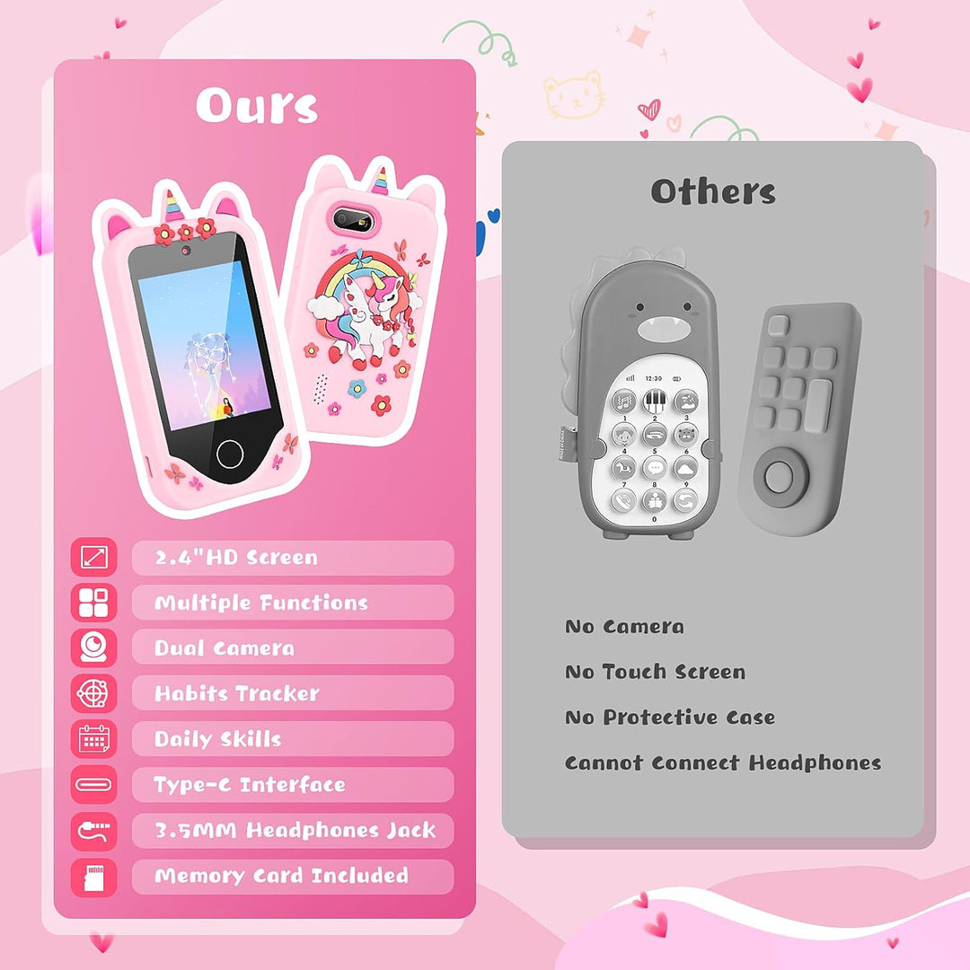 - 🦄【Einhorn Kinder-Multifunktions-Smartphone】 Dieses Kinder-Handy mit 2,4-Zoll-HD-Bildschirm ist mit mehreren Funktionen wie Kamera, MP3-Musik-Player, Video-Player, Dual-Kameras, Mini-Spiele, Wecker, Taschenlampe, Taschenrechner, Kalender und