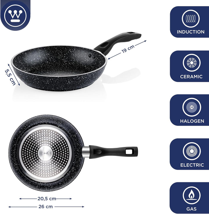 - 👍 GESUNDE ANTI-HAFTBESCHICHTUNG: Unsere 3-fache Antihaftbeschichtung aus verstärktem Marmor lässt Sie gesündere Speisen mit wenig oder keinem Öl zubereiten. Die Westinghouse Bratpfanne Induktion 26cm ist 100% PFOA frei und Sie sind somit