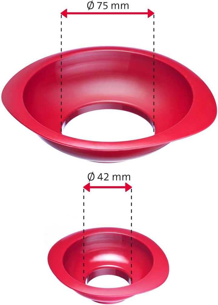 - Gute Handhabung durch passgenaues Aufliegen der Trichterschalen auf den Behältnissen, komfortabler Halt durch breiten, leicht umgebogenen Rand