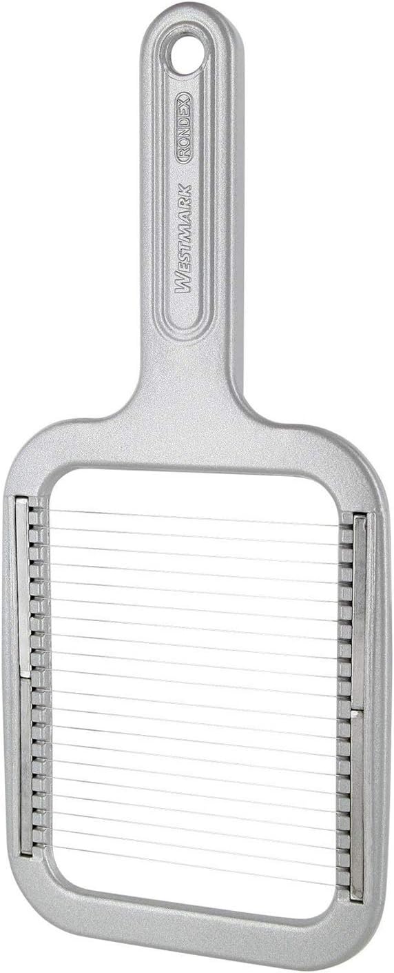 - Produkt 2: Müheloses Schneiden dank 20 straff gespannter, scharfer Drähte aus rostfreiem Edelstahl, geeignet für ganze Mozzarella und kleine sowie grosse Pellkartoffeln