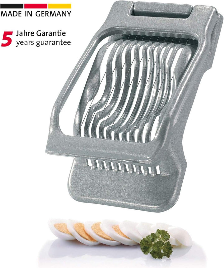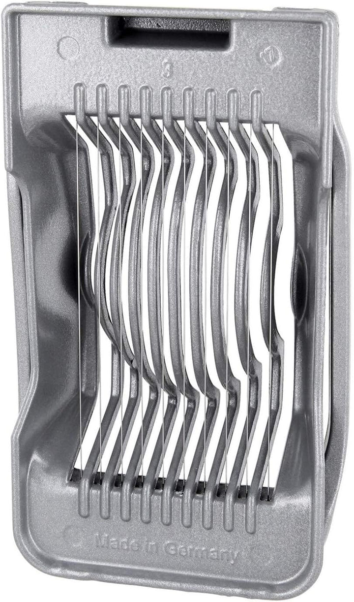 - Produkt 1: Müheloses Schneiden dank ergonomisch nach oben gebogenem Griff und 10 straff gespannter, scharfer Drähte aus rostfreiem Edelstahl. Geeignet für Eiergrösse S-L, Schneidefläche von ca. 5,5 cm. Kein Zerbrechen des Eigelbes.