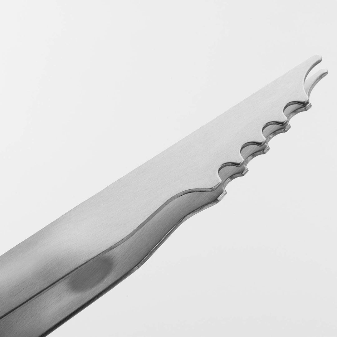 - Schräge, gezahnte Enden aus rostfreiem Edelstahl für festen Halt des Brat- und Grillgutes beim Wenden am heissen Grill