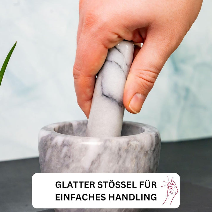 - Edler, hoher Mörser inkl. Stössel aus Marmor zum leichten Zerstossen und Mahlen von verschiedenen Gewürzen, harten Gewürzkapseln und Kräutern für die Zubereitung von frischen, gesunden Speisen