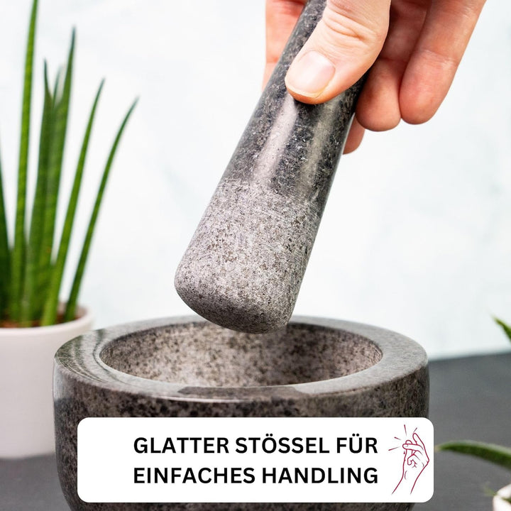 - Edler, grosser Mörser inkl. Stössel aus Natur-Granit zum leichten Zerstossen und Mahlen von verschiedenen Gewürzen, harten Gewürzkapseln und Kräutern für die Zubereitung von frischen, gesunden Speisen