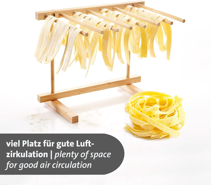 - SICHER – Der Bambus des Trockenständers ist mit einer lebensmittelechten Spezialbeschichtung versehen, die eine hygienische Verwendung gewährleistet und Ihre selbstgemachte Pasta unverfälscht hält.