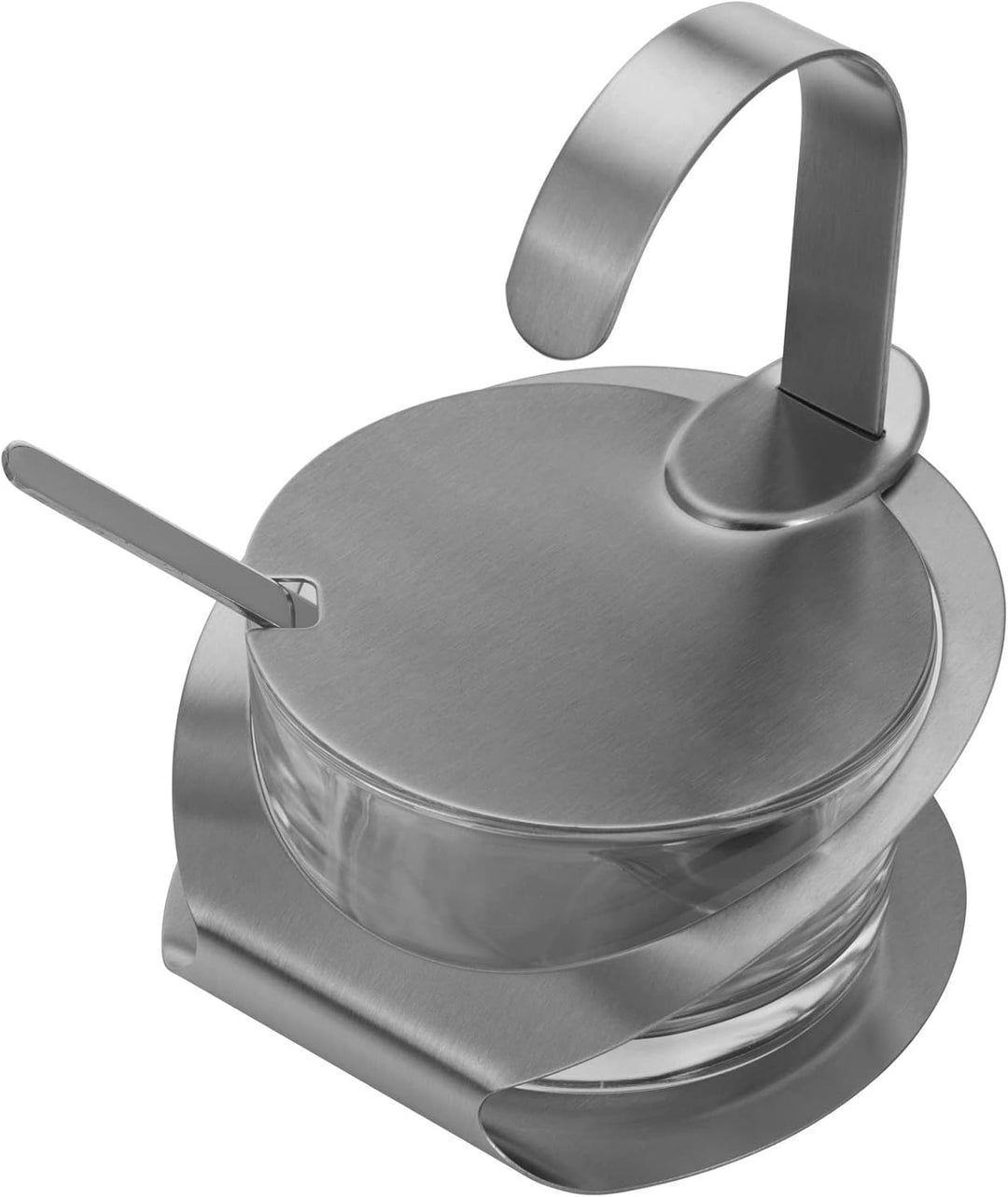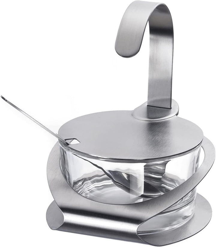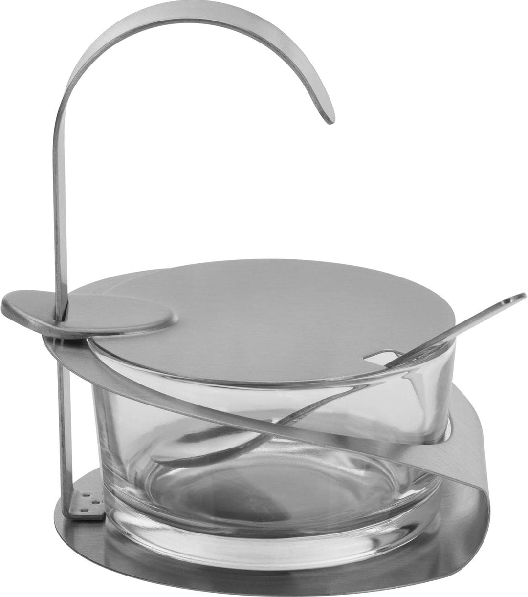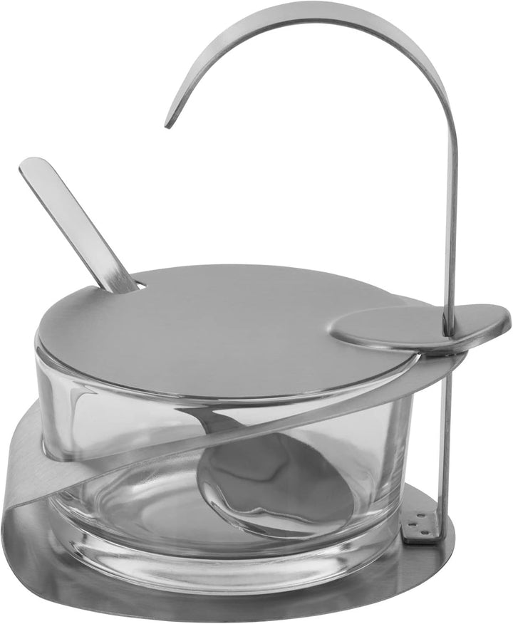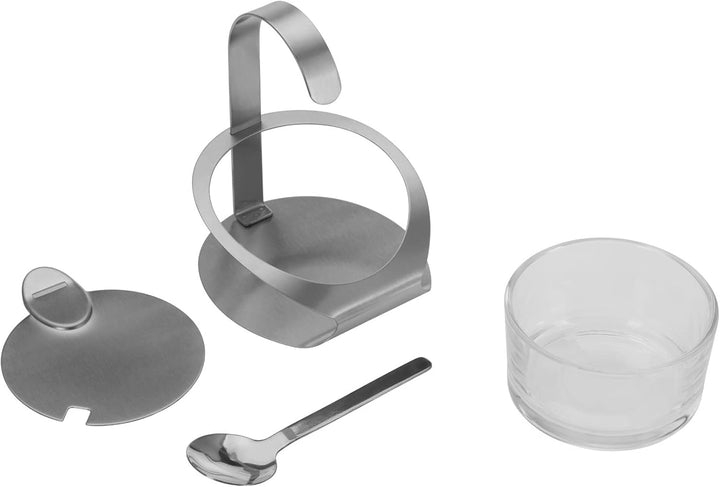- Parmesan-/Zuckerbehälter aus Glas, mit Deckel, Löffel und Ständer aus rostfreiem Edelstahl