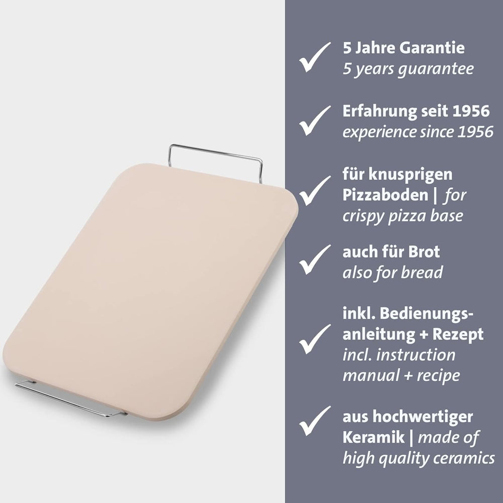 • Lieferumfang: 1x Westmark Pizzastein, rechteckig, mit Verpackung, 5 Jahre Garantie, Masse: 43,5 x 30,5 x 3,8 cm (L x B x H), Material: Keramik/Verchromtes Metall, Farbe: Beige/Silber, 32422260