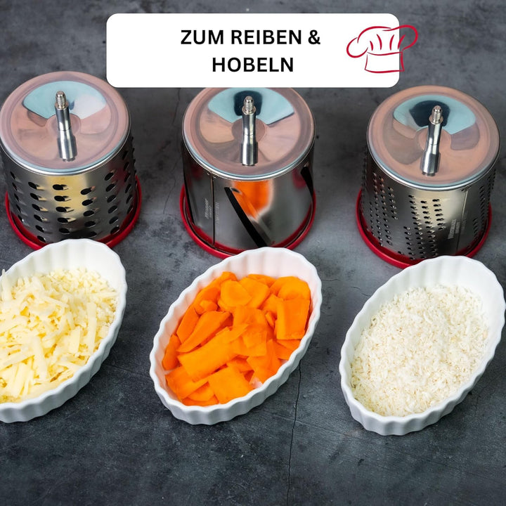 - Reibemaschine mit 4 Trommeleinsätzen zum groben, mittleren und feinen Reiben sowie zum Hobeln, geeignet für Obst, Gemüse, Käse, Nüsse und Schokolade