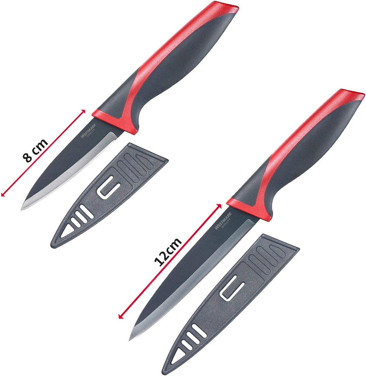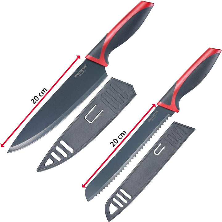 • Lieferumfang: 1 x Westmark Küchenhelfer-Set, 5tlg., 5 Jahre Garantie, Inhalt: je 1x Schneidbrett, Chefmesser, Brotmesser, Allzweckmesser und Schälmesser, Material: Kunststoff (PP/TPE)/Edelstahl, Farbe: anthrazit/rot, 145222E6
