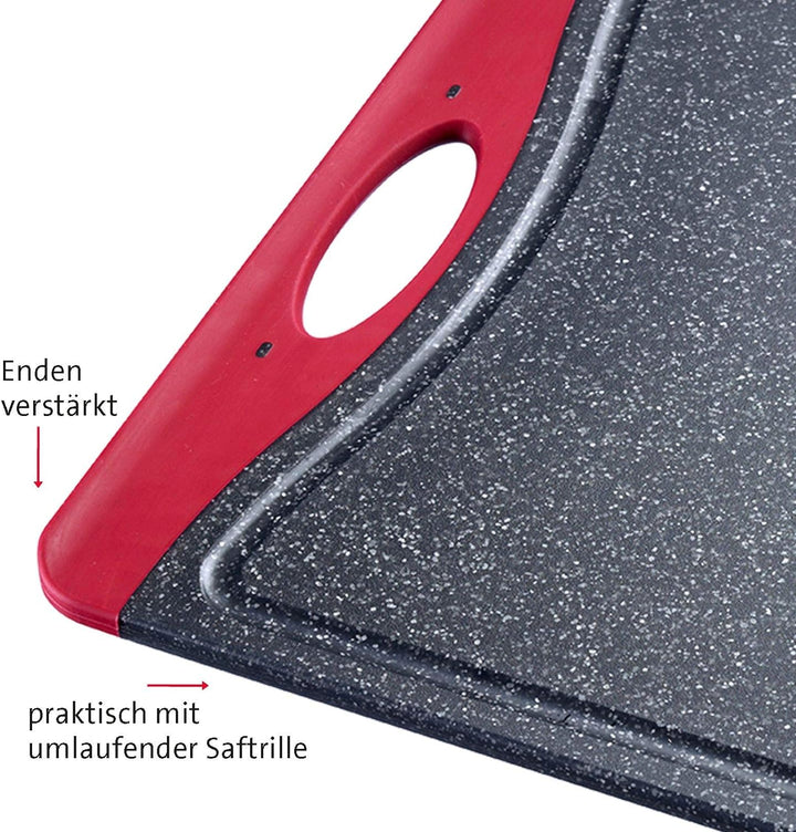 • Schneidbrett mit umlaufender Saftrille, rote Randelemente aus rutschfestem Material sorgen für sicheres Aufliegen auf der Arbeitsfläche