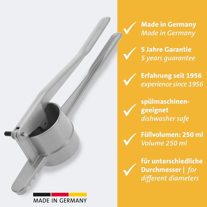 • Grosser Pressbehälter, Füllvolumen ca. 250 ml, klassische Rund-Lochung (Lochdurchmesser ca. 3mm), die langen Hebelarme ermöglichen eine optimale Kraftübertragung für einfaches und schnelles Pressen von Spätzleteig, Kartoffeln, Früchten oder Eis