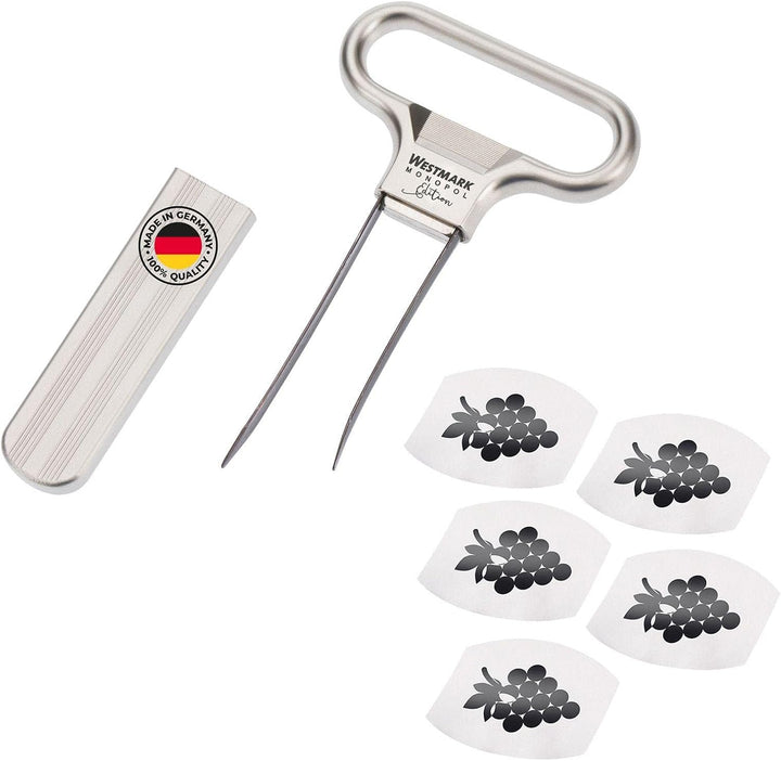 - Lieferumfang: 1x Westmark Wein-Set, 6tlg.: bestehend aus je 1x Ent-/Verkorker, Ah So, (Monopol Edition, 5 Jahre Garantie) + 5x Weinausgiesser Safety, Material: Stahl/Zink-Druckguss/PET, Farbe: Edelmattiert/Silber/Schwarz, 628533E7