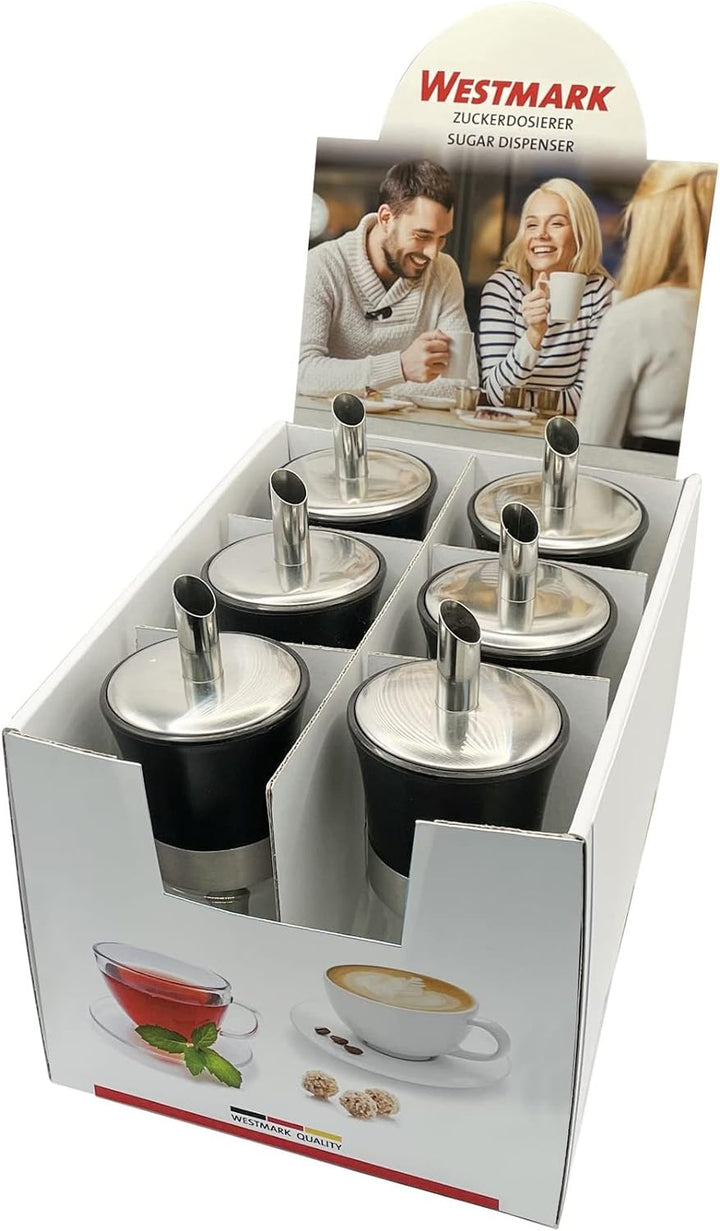 - Lieferumfang: 1x Westmark Zuckerdosierer-Display, Inhalt: 6 Stück, Blacky, 5 Jahre Garantie, Masse: je 68 x 68 x 17,5 mm, Material: Glas/Rostfreier Edelstahl/Kunststoff (PP), Farbe: Transparent/Schwarz/Silber, 63592611