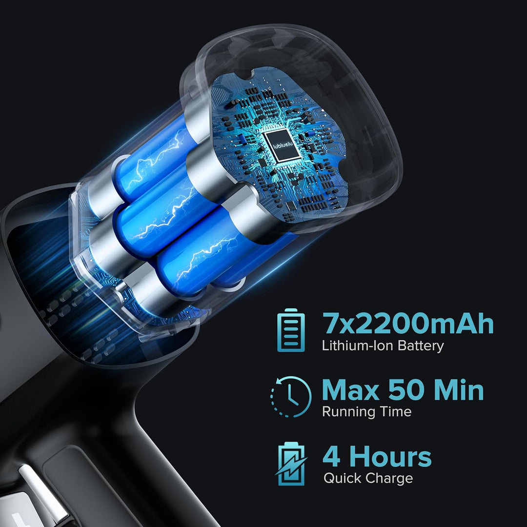 - 7-Zellen-Lithium-Ionen-Akku mit 2200mAh grosser Kapazität braucht etwa 4-5 Stunden, um vollständig aufgeladen zu werden. Die Anzeigelampen leuchten während des Ladevorgangs und hören nach einer vollständigen Aufladung auf zu blinken.