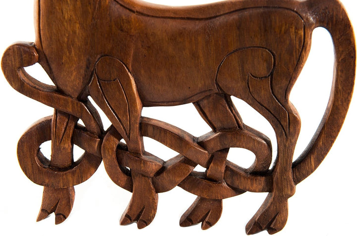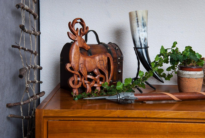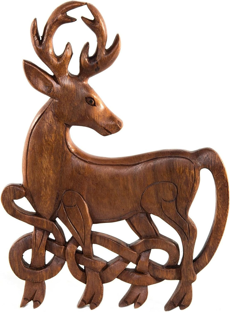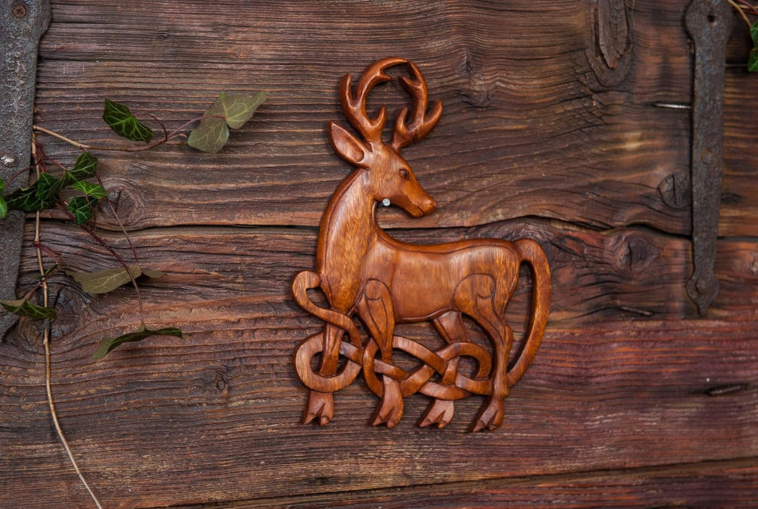 PRODUKTBESCHREIBUNGEN Eine handgeschnitzte, keltische Wanddeko mit einem prachtvoll verziertem Hirsch, aus edlem Holz. Bei den Kelten wird der Gott des Waldes und der Tiere Cernunnos genannt, dargestellt mit einem Geweih. Dieser Hirsch mit seinem prächtigen Geweih, seiner majestätischen, kraftvollen Erscheinung ist Symbol für Männlichkeit, Stärke und Führungskraft.