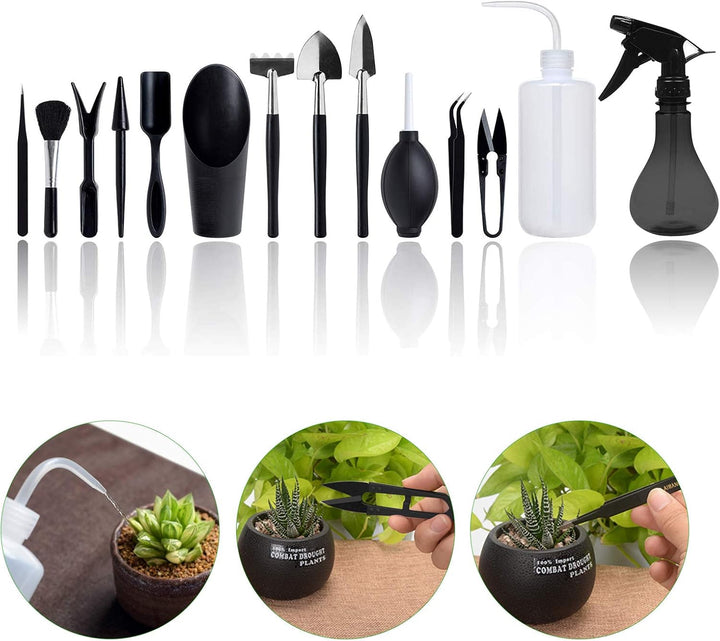 - Sukkulentenwerkzeuge - 1 Giessflasche, 1 Reinigungsbürste, 1 Paar Pinzette mit gebogener Spitze, 1 Paar Pinzette mit gerader Spitze, 1 Blattschneider, 1 Luftstaubgebläse, 2 Transplantationswerkzeuge, 2 Eimerschaufelsatz, 3 Rechenspatenschaufel, 1